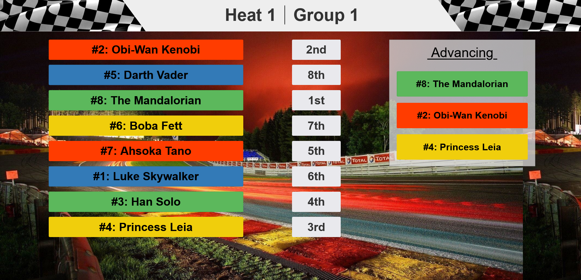 status of racers as they win and lose races until they are either eliminated or make it to the finals. The final race ends with a 1st, 2nd and 3rd place winner.
