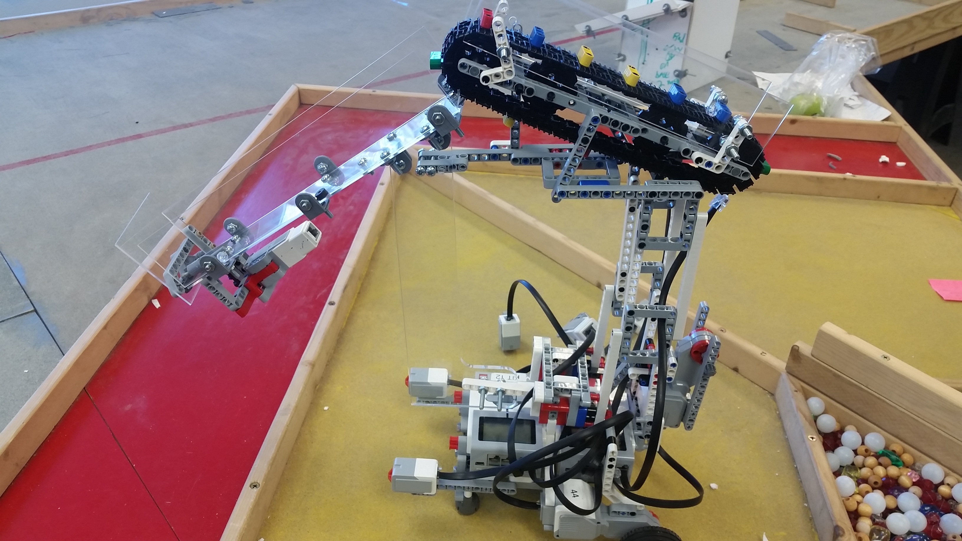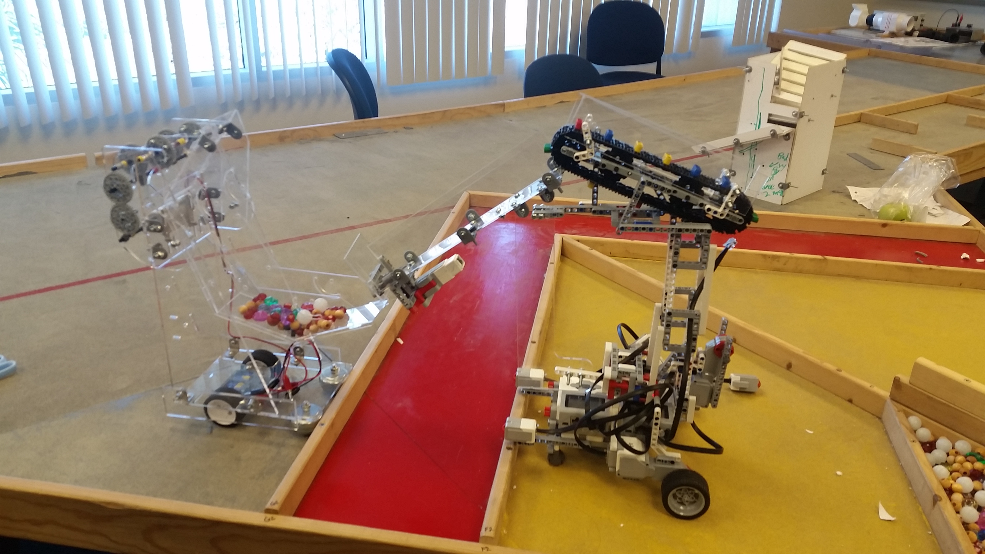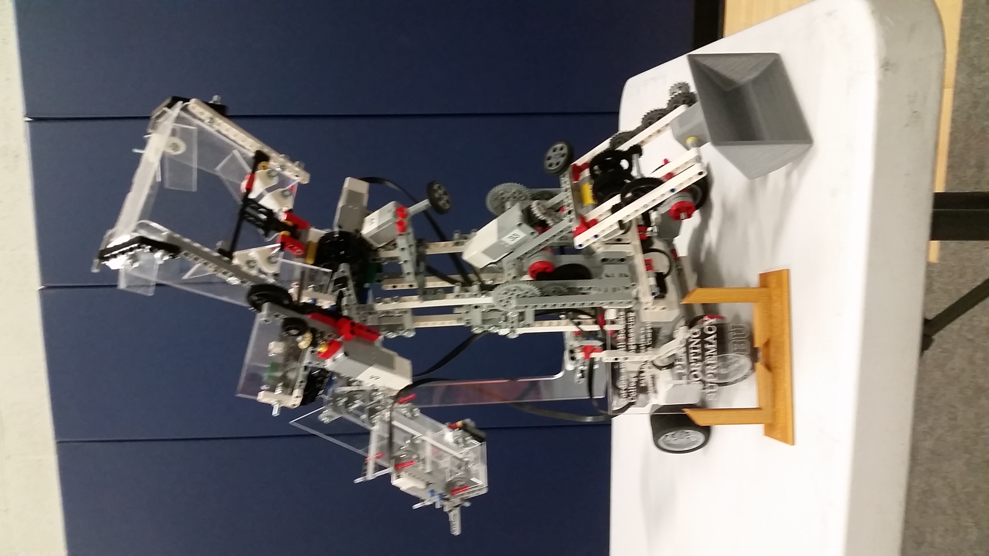 As part of EGR102: Intro to Engineering Design, students created a robot using the Lego Mindstorms EV3 set. The goal was to pick up and sort as many of the items as possible in a limited time-span. The teams were broken into three sub-teams, Acquisition (pick up the items), Transport (move the items across a play field), and Sorting (sort the items into their respective bins). Teams got points for how many items they retrieved and a bonus for how many of each item was in the correct bin.