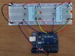 The traffic light control board was developed as a small-scale demonstration of the logic that goes into a traffic light. The program was developed on an Arduino Uno control board using C++. The software was developed as a Mealy Finite State Machine (FSM) that takes in inputs from the "traffic sensors" (represented by simple push switches) and then determines what state to move to next based on those inputs and the current state. The states are represented by the LEDs which are made to represent a traffic signal (Each set has a red, yellow, and green light).