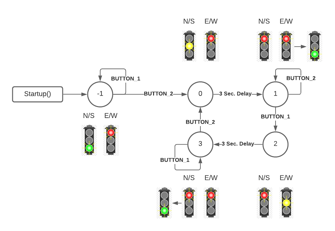 The following state diagram was developed and used to understand the logic that would go into the code of the FSM.